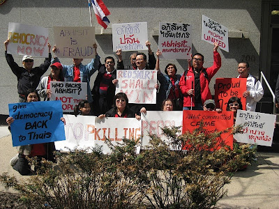 ประณามทรราชและผู้หนุนหลัง-เมื่อวันจันทร์(12เม.ย.)คนไทยในต่างประเทศทั่วโลก รวมทั้งสหรัฐฯ(ภาพบน) อังกฤษ(ภาพกลาง) และออสเตรเลีย(ภาพล่าง)รวมตัวกันประท้วงรัฐบาลและ"ผู้มีอำนาจหนุนหลัง"ที่สังหารผู้เรียกร้องประชาธิปไตยหน้าสถานทูตไทย โดยมีข้อเรียกร้องให้ดำเนินคดีอาชญากรต่ออภิสิทธิ์ เวชชาชีวะด้วย นอกจากความรับผิดชอบทางการเมือง