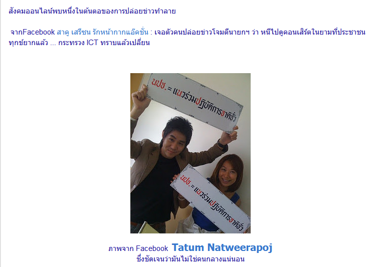 ต้นตอปล่อยข่าวนายกฯไม่สนใจแก้น้ำท่วมหนีไปดูคอนเสิร์ต-เว็บไซต์FreeThaiได้ แสดงหลักฐานตัวการที่เป็นต้นตอการปล่อยข่าวว่านายกฯยิื่งลักษณ์ไม่ใส่แก้ไข ปัญหาน้ำท่วม หนีไปดูคอนเสิร์ต เป็นผู้ใช้ชื่อล็อกอินทางทวิตเตอร์ว่า Tatum Natweerapoj