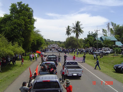 ...บริเวณหน้าสนามบินมีหัวหน้าส่วนราชการ กำนัน ผู้ใหญ่บ้าน กลุ่มพลังมวลชน และประชาชนกว่า 500 คน สวมเสื้อยืดสีขาวมีข้อความว่า “เรารักนายกฯ” มารอต้อนรับ ท่ามกลางการรักษาความปลอดภัย (รปภ.) อย่างเข้มงวด ทั้งตำรวจ ทหาร อพ.ปร. ยืนคุ้มกันตลอดเส้นทางที่คณะนายกฯผ่าน มีเฮลิคอปเตอร์บินติดตามขบวนนายกฯไปทุกจุด ระหว่างทางมีกลุ่มชายฉกรรจ์สวมเสื้อสีน้ำเงินตั้งด่านสกัดกลุ่มเสื้อแดงที่จะเคลื่อนมาชุมนุมขับไล่นายกฯตามถนนสายต่างๆ เช่นที่สี่แยกบ้านกระสัง อ.เมือง เป็นต้น