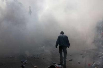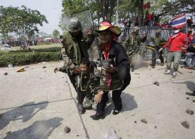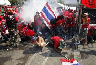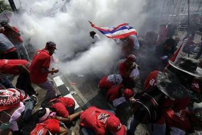 ยืนหยัด-ผู้ชุมนุมเสื้อแดงเดินสู้แก๊สน้ำตาอย่างยืนหยัดระหว่างการเข้าสลายการชุมนุมของกองกำลังทหารช่วงบ่ายวันนี้ที่บริเวณสะพานผ่านฟ้า มีประชาชนได้รับบาดเจ็บ 93 ราย ทหาร-ตำรวจบาดเจ็บ22ราย(ภาพข่าว:รอยเตอร์)