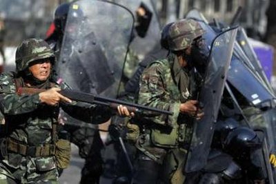 กวาดล้างVSยืนหยัด-กองกำลังทหารยิงแก๊สน้ำตาและกระสุนยางใส่ผู้ประท้วง โดยอ้างว่าเพื่อ"ขอพื้นที่ราชดำเนินคืน"ตลอดบ่ายวันนี้ ขณะที่ผู้ชุมนุมได้ยืนหยัดต่อสู้ไม่ถอยหนี แม้มีผู้ได้รับบาดเจ็บ ในเวลา16.20TPBSรายงานว่าเบื้องต้นมีผู้ได้รับบาดเจ็บส่งโรงพยาบาล30คน ขณะที่รัฐบาลกร้าวจะยึดพื้นที่ราชดำเนินให้ได้ภายใน18.00น. (ภาพข่าว:สำนักข่าวต่างประเทศ)