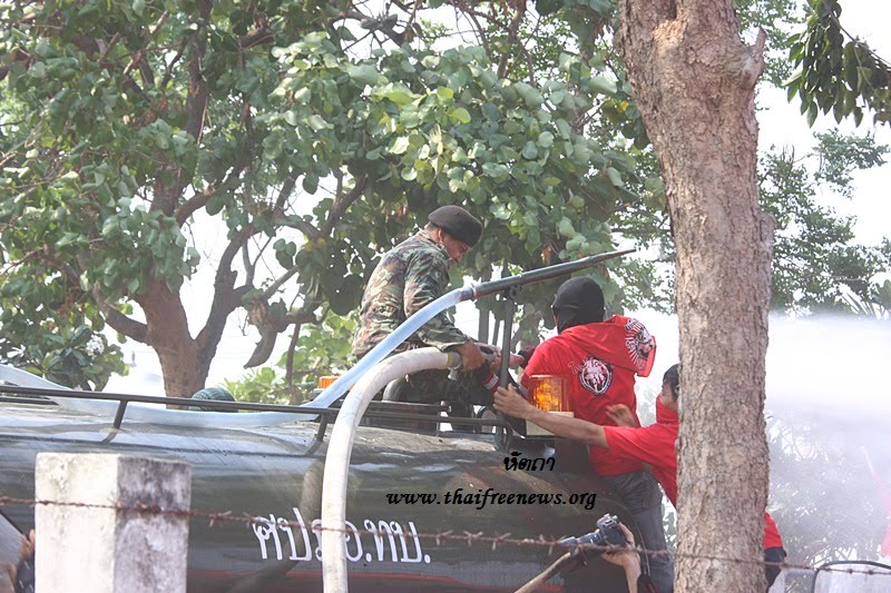 *ทหารได้ฉีดน้ำใส่ผู้ประท้วงก่อนเพื่อสกัดกั้นการบุกเข้าไปยังที่ทำการไทยคม