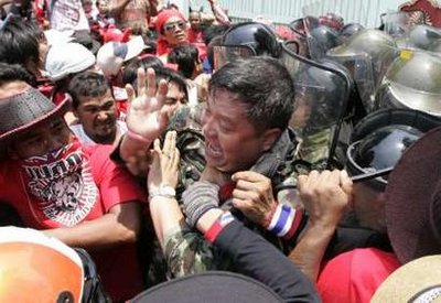 Abhisit justifies his state of emergency on the grounds that the Red Shirts are blocking shopping centres! This is a lie, one of many lies told by the Thai Prime Minister. Another lie is that the Red Shirt media is advocating violence. They have done nothing of the kind. Yesterday’s brief invasion of the parliament grounds by Red Shirts was in response to CS gas canisters being thrown at the peaceful crowd outside.