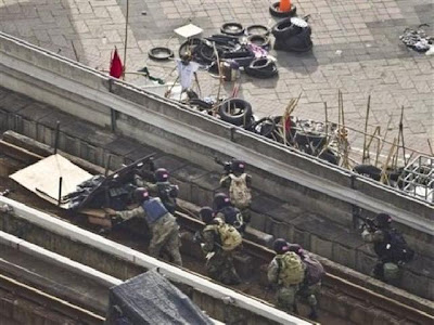 จู่ๆ เสียงกระหน่ำยิงก็ดังขึ้น และดูเหมือนจะใกล้เข้ามาเรื่อยๆ เสียงปังๆ ถี่ขึ้น เสียงปืนแก๊ป (ของกลุ่มคนเสื้อแดง) ฟังแล้วไม่น่าเชื่อว่าจะสามารถเด็ดชีวิตผู้คนได้