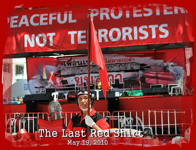 ที่มา Thai E-Newsน้ำใจกล้าหาญเด็ดเดี่ยวของมวลชน -ภาพที่มีชื่อเสียงภาพหนึ่งของเหตุการณ์วันที่ 19 พฤษภาคม 53 คือ The last Red shirt เป็นภาพเหตุการณ์ที่ผุสดี งามขำ เสื้อแดงคนสุดท้ายนั่งปักหลักอยู่หน้าเวทีราชประสงค์ ภายหลังแกนนำคือณัฐวุฒิกับจตุพรประกาศยุติการชุมนุมเข้ามอบตัวกับรัฐบาล โดยมวลชนจำนวนมากไม่เห็นด้วย ขณะที่ผุสดีกล่าวภายหลังว่าเธอนั่งปักหลักอยู่เป็นคนสุดท้ายเพื่อเป็นการรักษาคำมั่นสัญญากับแกนนำว่าจะยืนหยัดต่อสู้จนถึงที่สุดไม่ยอมแพ้