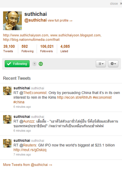 เฮีย สุทธิชัย หยุ่น นายใหญ่ค่ายเนชั่น สื่อกระบอกเสียงระบอบอำมาตย์อภิสิทธิ์ ได้ออกมาตอบโต้เฮียสนธิ ลิ้ม นายใหญ่ค่ายผู้จัดการ สื่อกระบอกเสียงผู้ก่อการร้ายพันธมิตร ผ่านทางทวิตเตอร์