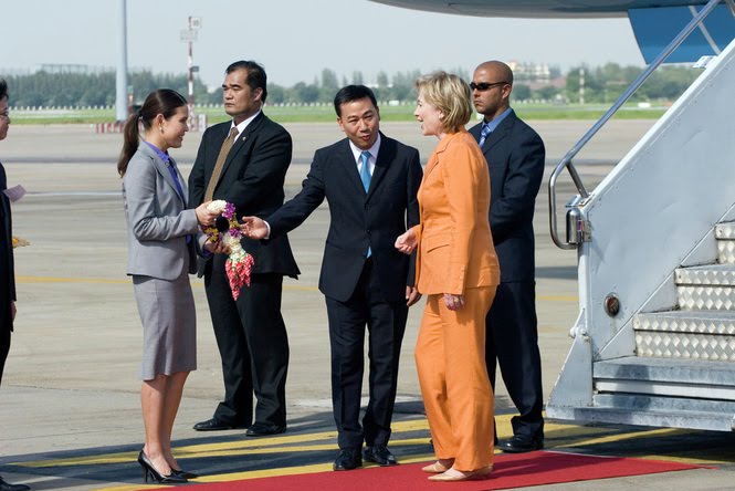 ชะตากรรม-ภาพบน นายพนิช วิกฤตเศรษฐ เมื่อครั้งเป็นผู้ช่วยรัฐมนตรีต่างประเทศต้อนรับนางฮิลลารี่ คลินตันที่มาเยือนไทย เขามีบทบาทสำคัญในการไล่ล่าตัวพ.ต.ท.ทักษิณ ชินวัตร ในต่างประเทศแต่ล้มเหลว ส่วนภาพล่างเป็นภาพกราฟฟิกที่คนในเฟซบุ๊คทำขึ้นว่า นายพนิชอาจต้องใส่ชุดนักโทษกัมพูชาแบบนี้ในเวลานี้ และเสียดสีว่านายอภิสิทธิ์ไม่สนใจชะตากรรมลูกพรรคที่ต้องติดคุกเพราะไปทำงานคำสั่งของตัวเอง ขณะที่ตัวเองตัดช่องน้อยแต่พอตัวไปเพลิดเพลินเที่ยวน้ำตกชมวิวได้แบบใจจืดใจดำ ลอยแพลูกน้อง