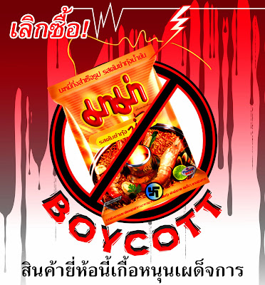 ดังนั้นทางองค์กรจึงขอให้เพื่อนสมาชิกช่วยกันกระจายข่าวบอกต่อกับคนที่ไม่รู้ด้วย และช่วยกันพิมพ์เอกสาร Boycott นี้ ไปติดตามที่สาธารณะและเผยแพร่ไปตามชุมชนต่างๆได้รับทราบกันด้วย ซึ่งเพื่อนสมาชิกทุกคนสามารถทำไ้ด้เลยตั้งแต่บัดนี้เป็นต้นไป***