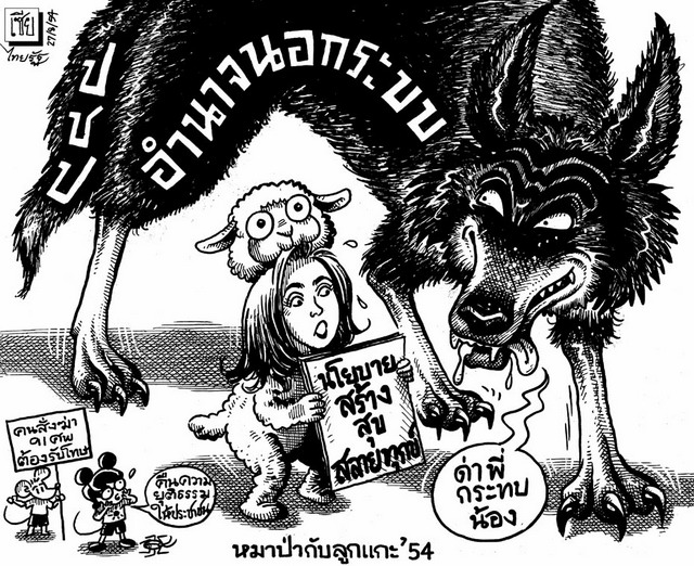“ดูเหมือนสมมุติฐานของ Montesquieu จะใช้ได้กับคนทั่วไป แต่ใช้ไม่ได้เลยกับนายกพอเพียงที่ชื่อสุเมธ ตันติเวชกุล ของพวกเรา” [47]